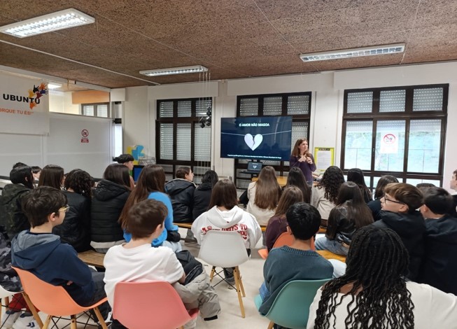 Durante a palestra, os alunos tiveram oportunidade de participar, colocar questões e refletir sobre situações do quotidiano, compreendendo melhor a diferença entre comportamentos saudáveis e atitudes de controlo ou manipulação.