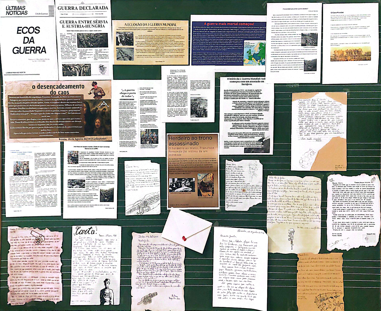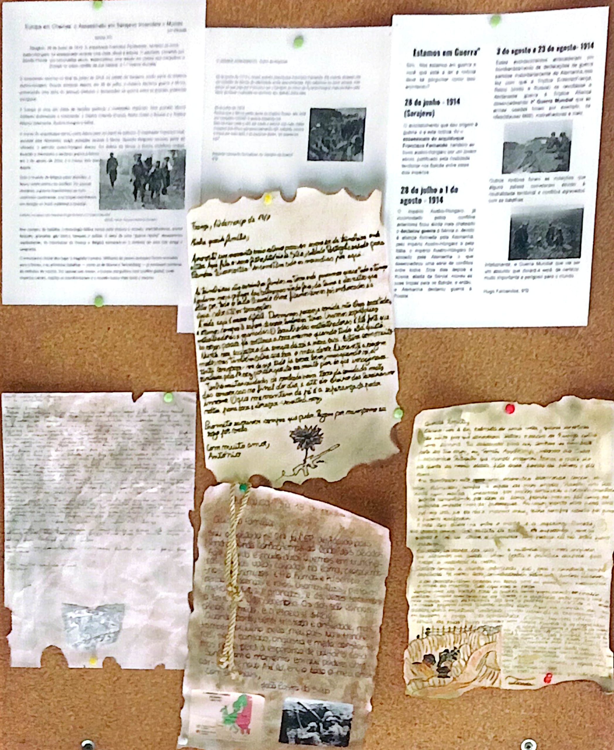 Foram também expostas “cartas de combatentes”, em que os alunos simularam aquilo que porque terão passado os combatentes nesse conflito, trabalhos feitos – turmas E,F,G,e H.